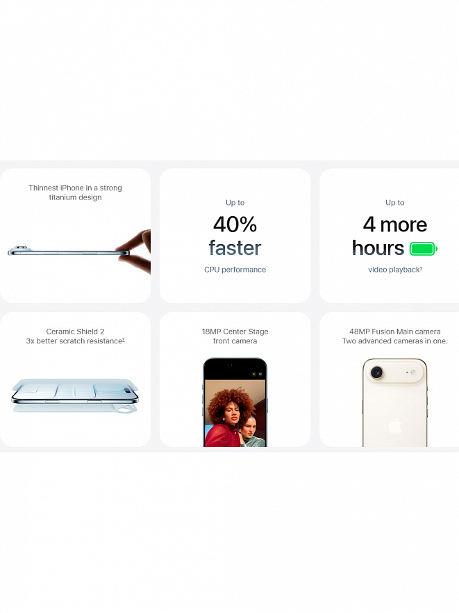 - Функции (Режимы) самый тонкий и лёгкий iPhone в титановом корпусе с мощным чипом A19 Pro, инновационной камерой 48 МП и поддержкой Apple Intelligence, обеспечивающий высокую производительность, долгую работу и про-уровень возможностей в минималистичном дизайне