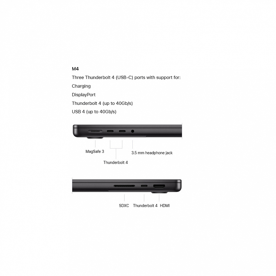 Ноутбук оснащён тремя портами Thunderbolt 4, HDMI, слотом для карт SDXC, разъёмом для наушников и портом MagSafe 3 для удобной и быстрой зарядки. Клавиатура Magic Keyboard с Touch ID обеспечивает комфортный набор текста и безопасную аутентификацию, а трекпад Force Touch точно реагирует на силу нажатия. Комплектуется адаптером питания USB‑C мощностью 70 Вт. Устройство поддерживает до двух внешних дисплеев и может быть конфигурировано с 16 до 32 ГБ объединённой памяти, обеспечивая плавную работу даже с ресурсоёмкими задачами.