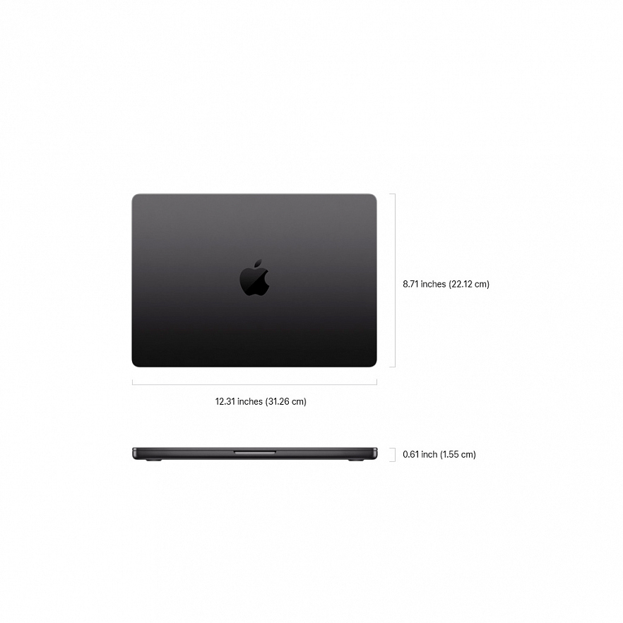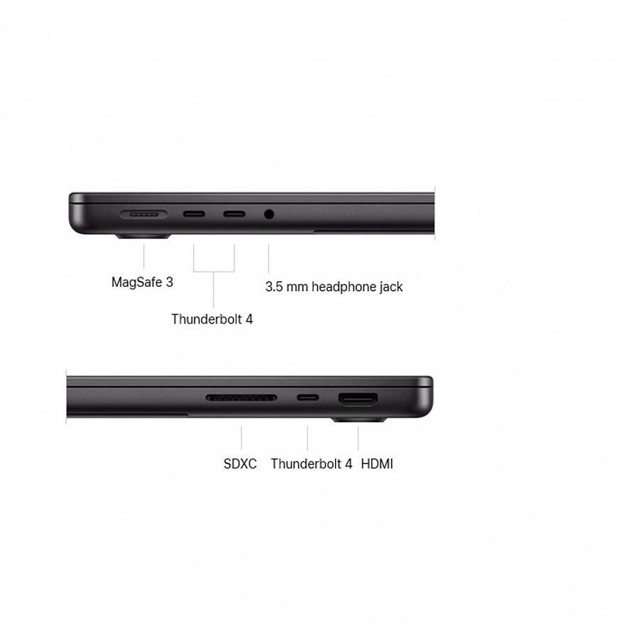 - Порты: MagSafe 3, HDMI, SDXC, 3.5 мм аудио, Thunderbolt 4/5;